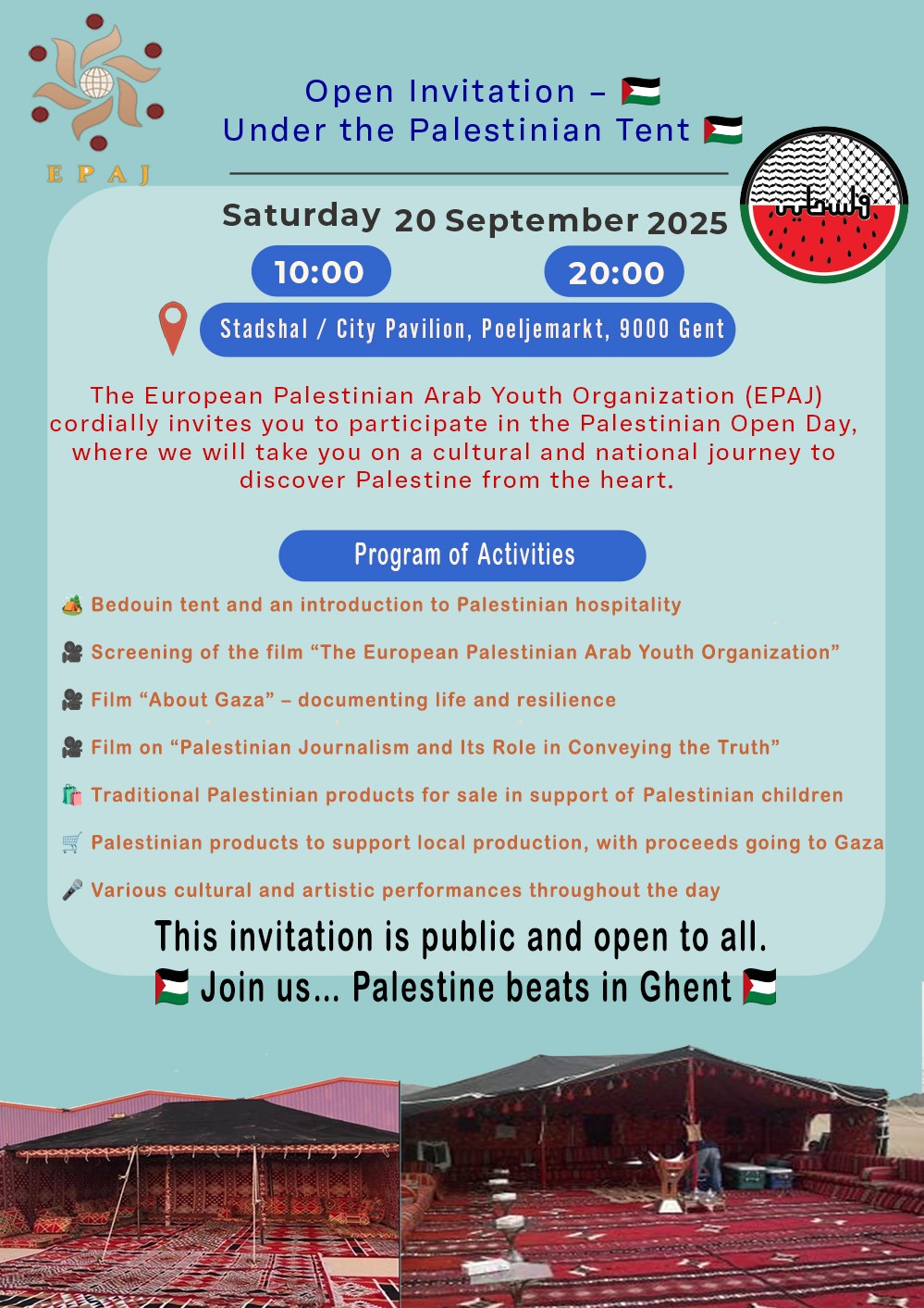 تتشرف جمعية الشباب العربي الفلسطيني الأوروبي (EPAJ) بدعوة الجمهور الكريم للمشاركة في اليوم الفلسطيني المفتوح تحت عنوان “تحت الخيمة الفلسطينية”، وذلك يوم السبت 20 سبتمبر 2025 في قاعة المدينة Stadshal / City Pavilion بمدينة غنت – بلجيكا، من الساعة العاشرة صباحاً حتى الثامنة مساءً.